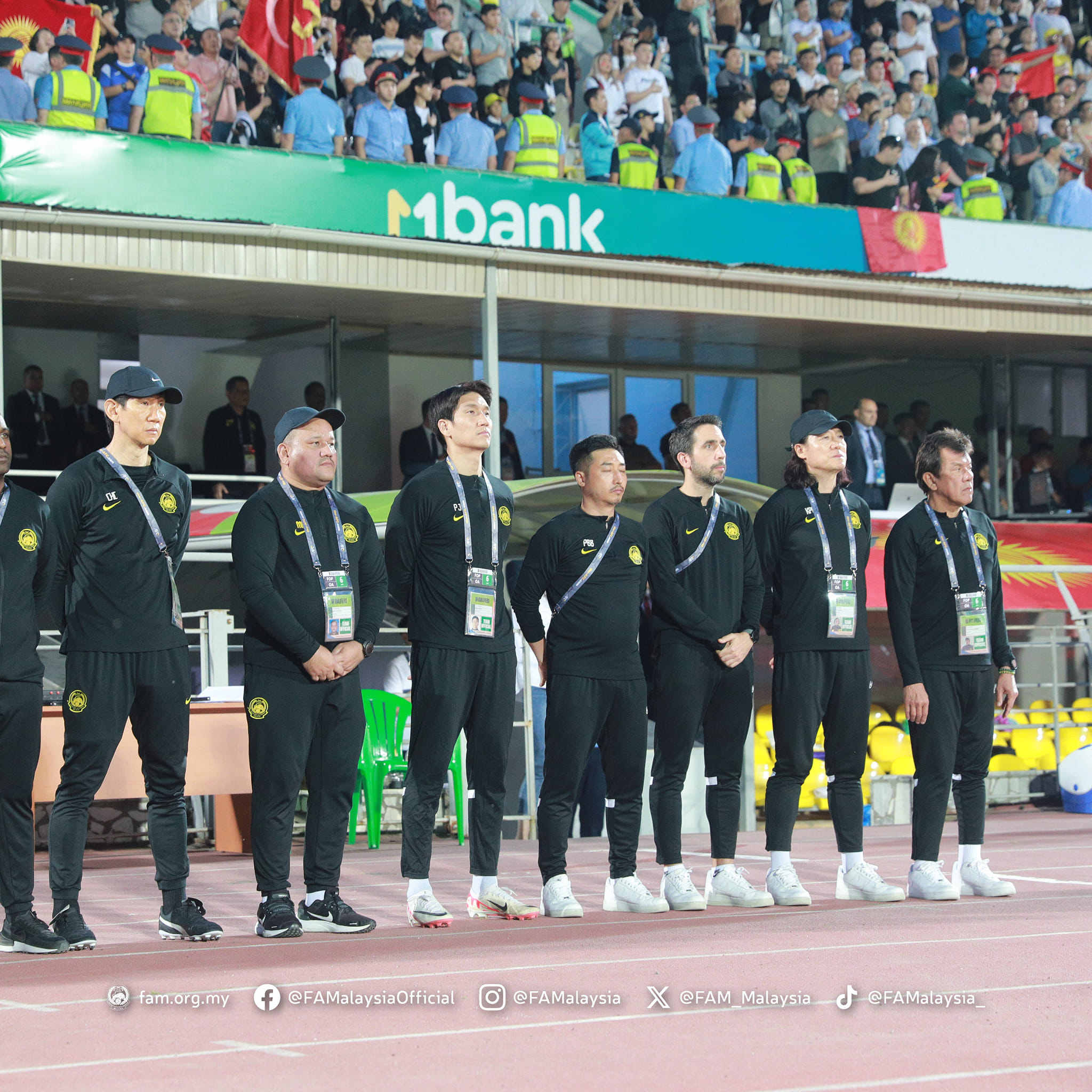 KIM Pan-gon (dua dari kanan) di samping barisan penolong jurulatih pasukan negara di tepi gelanggang ketika Malaysia berdepan Kyrgyzstan. - Kredit foto FAM