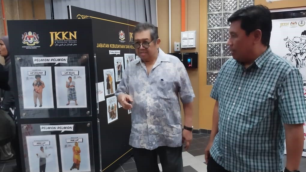 Hisham Mat Husien (kanan) berbual dengan Lat (kiri) semasa Lat menghadiri pra tonton teater Kampung Boy di Ipoh.