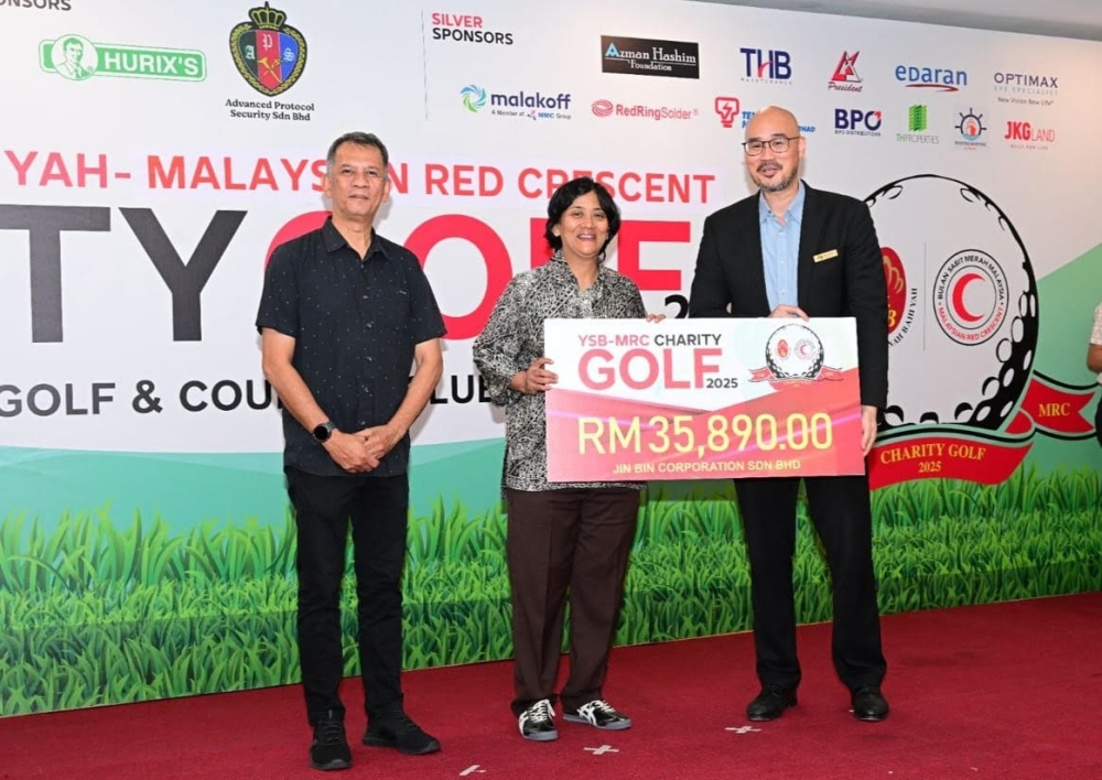 Tunku Puteri Intan Safinaz (tengah) menerima replika cek berjumlah RM35,890 daripada salah satu penaja Pertandingan Golf Amal YSB-BSMM 2025 iaitu Jin Bin Corporation Sdn Bhd yang disampaikan oleh Wilson Koay selaku Pengarah Perniagaan & Operasinya.