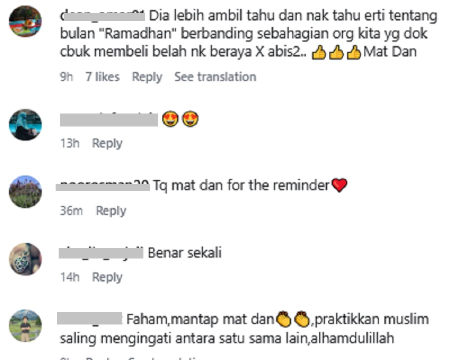“Dia lebih ambil tahu dan nak tahu erti tentang bulan Ramadan berbanding sebahagian orang kita yang terlalu sibuk membeli-belah nak beraya tak habis-habis. Terbaik Mat Dan,” tulisnya.