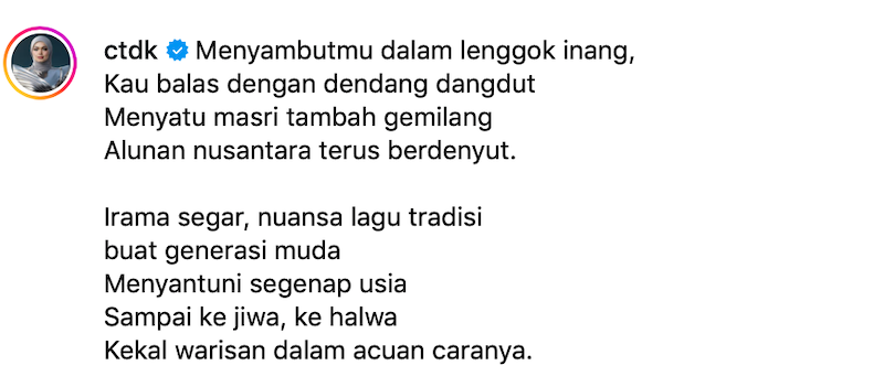 “Saya berterima kasih kepada Dato’ Seri Siti Nurhaliza kerana mengundang saya berduet dalam lagu yang sangat indah ini. Para peminat kami sudah lama mendambakan kolaborasi ini dan akhirnya menjadi kenyataan,” kata Lesti atau pemilik nama sebenarnya, Lestiani Andriyani ini.