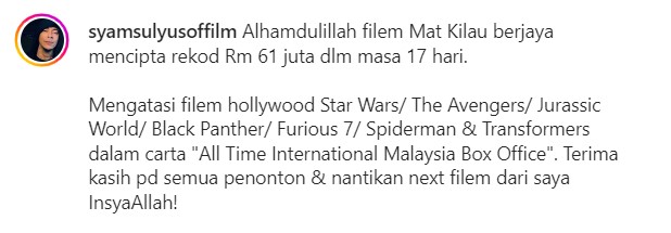 “Betul, betul. Kerana saya menghargai sokongan penonton,” ujar Abdul Rahman ketika ditanya kebenarannya oleh 'Abang Bard' sebagai hos pada pengumuman Pertandingan Parodi Mat Kilau yang dimuat naik dalam platform instagram @filem_matkilau.