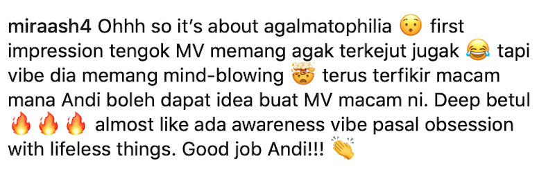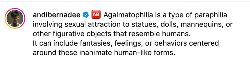 Menjengah ke laman Instagramnya, dapat dibaca Andi mengaitkannya dengan 'agalmatofilia' iaitu sejenis parafilia yang melibatkan tarikan seksual terhadap patung, anak patung, peragawati, atau objek kiasan lain yang menyerupai manusia.