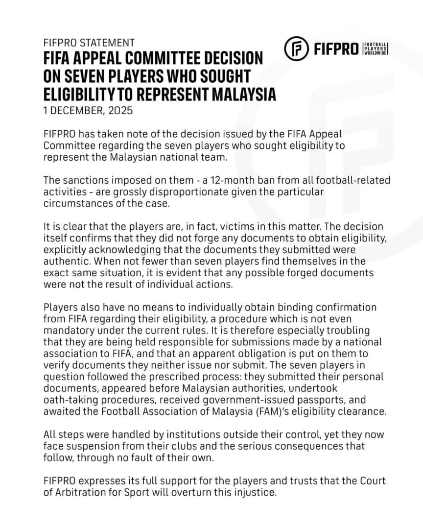 Sokongan FIFPRO sudah pasti melegakan pemain.
