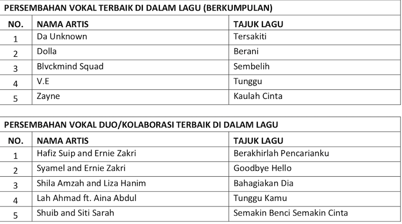 Ikuti senarai lain di bawah ini dan saksikan siapa pemenang setiap kategori pada 11 September kelak di Astro Ria secara langsung bermula pukul 9 malam. Mungkinkah tahun ini berpihak kepada Dayang Nurfaizah?