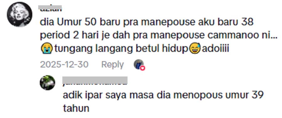 “Dia umur 50 baru pramenopaus. Aku baru 38 period dua hari je dah pramenopaus. Macam mana ni. Tunggang-langgang betul hidup,” kongsi salah seorang netizen.