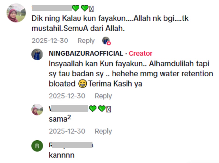“Assalamualaikum. Hai semua. Dua tiga hari lepas (penghujung Disember 2025), saya ada baca komen kelakar. Komen kata, ‘Eh, eh nampak macam Ning ada baby bump.’