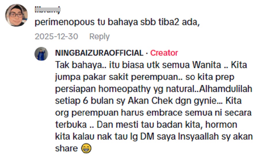 Tidak kurang juga yang menyuarakan kebimbangan mengenai keselamatan fasa perimenopause. “Perimenopaus tu bahaya sebab tiba-tiba ada?”