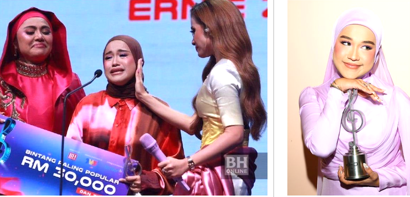 Gambar kiri: Ernie sebak menerima anugerah Bintang Paling Popular ABPBH dengan berpakaian santai berbandihg ketika menerima trofi Penyanyi Wanita Popular dalam gaun rona ungu muda (kanan). - Kredit foto: NSTP