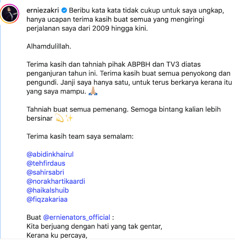 "Saya takkan dapat pengiktirafan ini kalau peminat-peminat saya tidak mengundi. Jadi saya nak buat special shout out to Ernienators kerana sudi memberikan saya merasa anugerah ini.