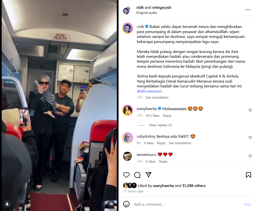 "Terima kasih kepada Pengerusi Eksekutif Capital A & AirAsia, Datuk Kamarudin Meranun kerana sudi menyediakan hadiah dan turut terbang bersama-sama," tulisnya.