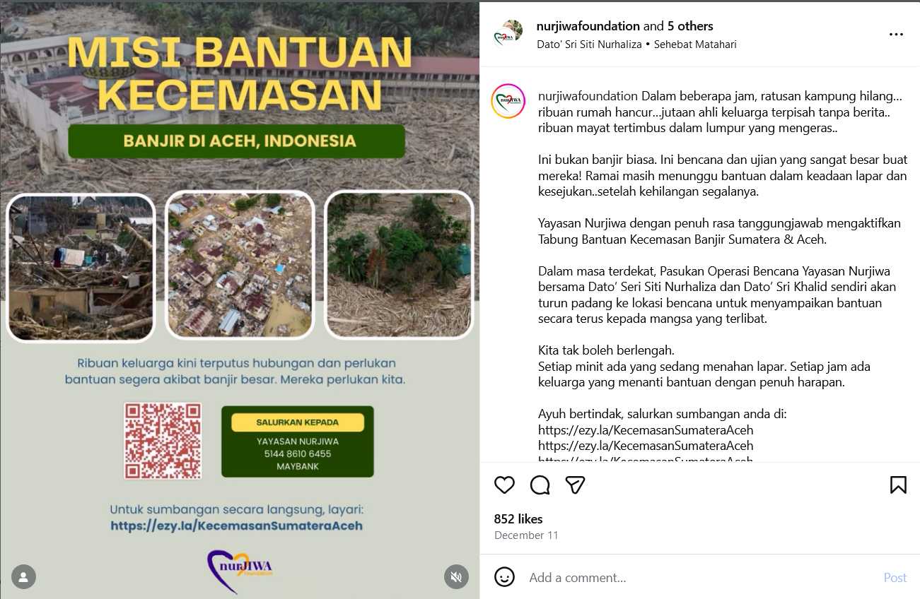 "Dalam setiap ujian, kemanusiaan menyatukan kita. Yayasan Nurjiwa menyantuni saudara serumpun di Acheh, menyalurkan amanah dan kasih sayang daripada rakyat Malaysia kepada mereka yang diuji.