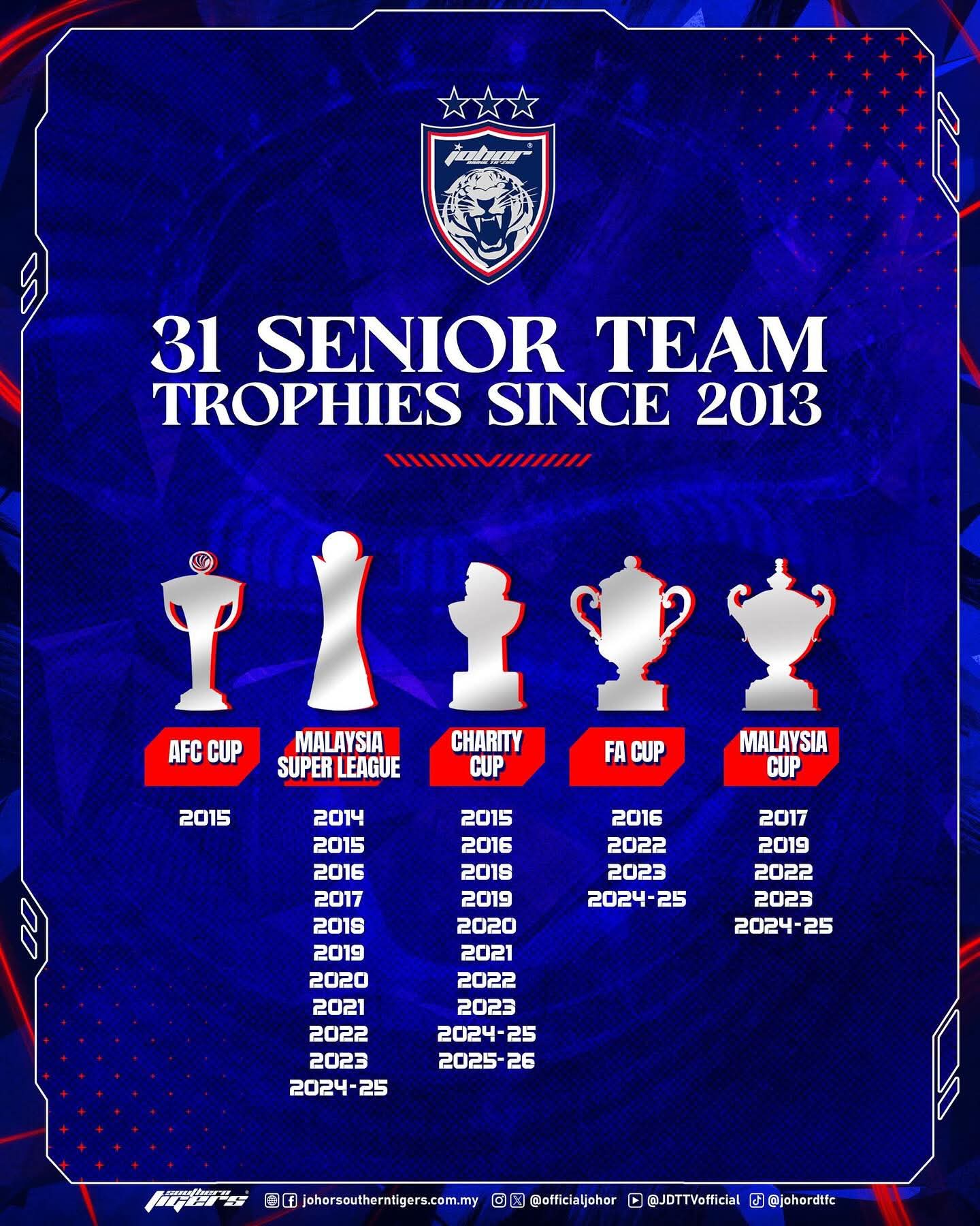 Malah kejayaan tersebut juga menjadi isyarat bahawa JDT akan terus mendominasi kesemua empat trofi yang ditawarkan dalam saingan domestik.