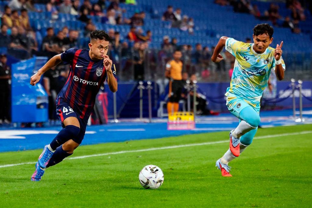 Kepantasan Arif Aiman sukar dicabar pemain pertahanan Penang ketika pertemuan kedua-dua pasukan dalam saingan Liga Super yang menyaksikan JDT menang 6-0. - Kredit foto: The Sun.