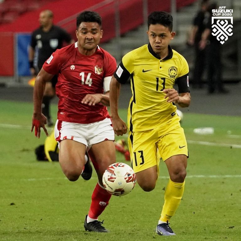 Arif Aiman mencabar pemain Indonesia ketika mewakili negara di kejohanan AFF Suzuki Cup 2020. Kredit foto : -Facebook AFF Suzuki Cup.