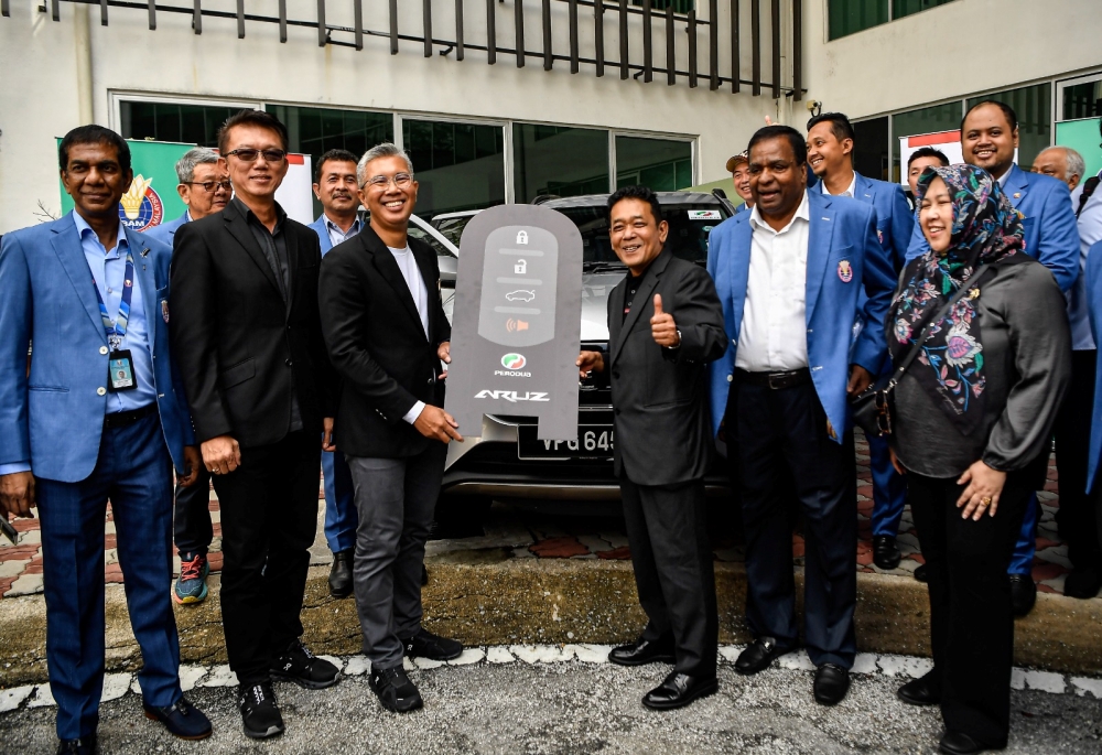 Tengku Zafrul Tengku Abdul Aziz (tiga kiri) menerima replika kunci kenderaan pelbagai guna (MPV) Perodua Aruz sebagai simbolik penyerahan kepada BAM yang disampaikan oleh Ketua Pegawai Operasi Jualan Perodua, Datuk J H Rozman Jaafar (tiga dari kanan) pada Mesyuarat Majlis Persatuan Badminton Malaysia (BAM) di Bukit Kiara pada Sabtu 16 Ogos. - Kredit foto Bernama.