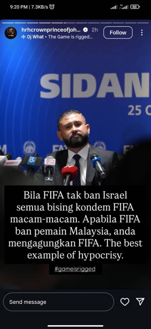 “Apabila FIFA tidak menggantung (mengharamkan) Israel, semua orang bising dan mengutuk FIFA pelbagai cara. Namun apabila FIFA menggantung pemain Malaysia, kamu pula memuji dan mengagungkan FIFA. Inilah contoh terbaik sifat hipokrasi,” titah baginda.