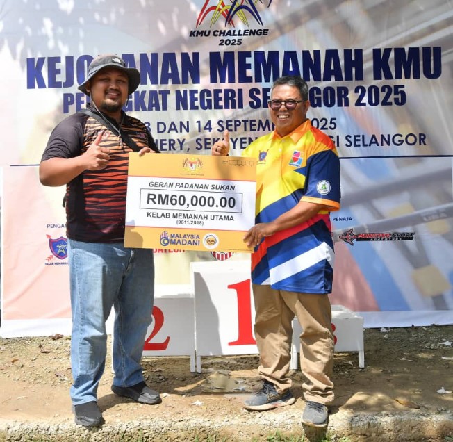 Mohd Akmal Adha Mohd Sanusi (kiri) menyerahkan Geran Padanan Sukan berjumlah RM60,000 kepada Khairunnizam Sarjuni sempena Kejohanan Memanah KMU peringkat Negeri Selangor 2025.