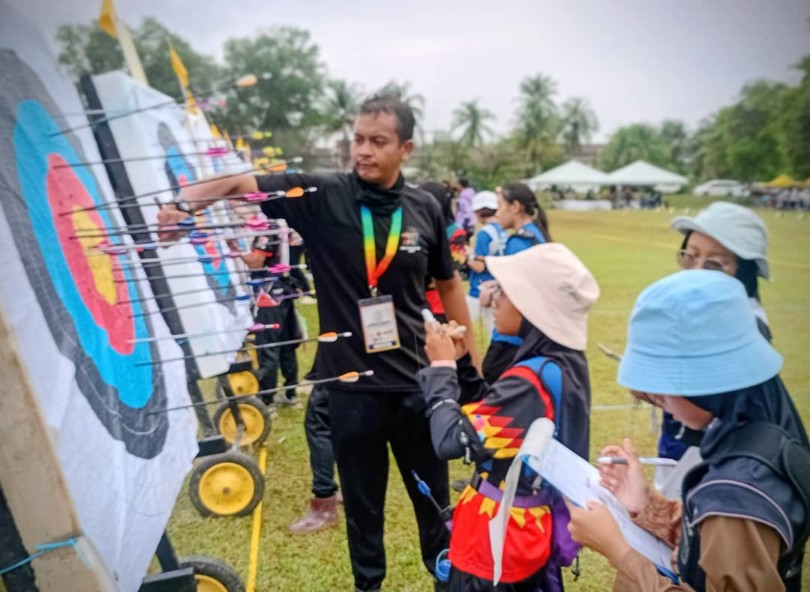 Jurulatih turut membantu peserta mencabut anak panah bagi memudahkan mereka mengira mata.