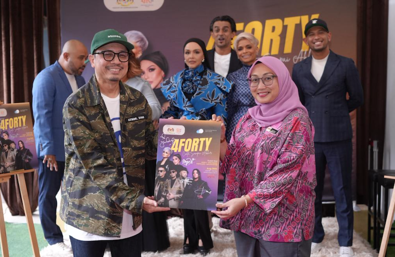 Aszuad Zakaria menyerahkan poster '4Forty' sebagai simbolik pelancaran single"Cinta Sampai Akhir' kepada Izzatul Shima Md Thahir sambil disaksikan oleh kumpulan 4 Forty serta artis undangan terbabit di Saprah KL pada 26 Ogos 2025.