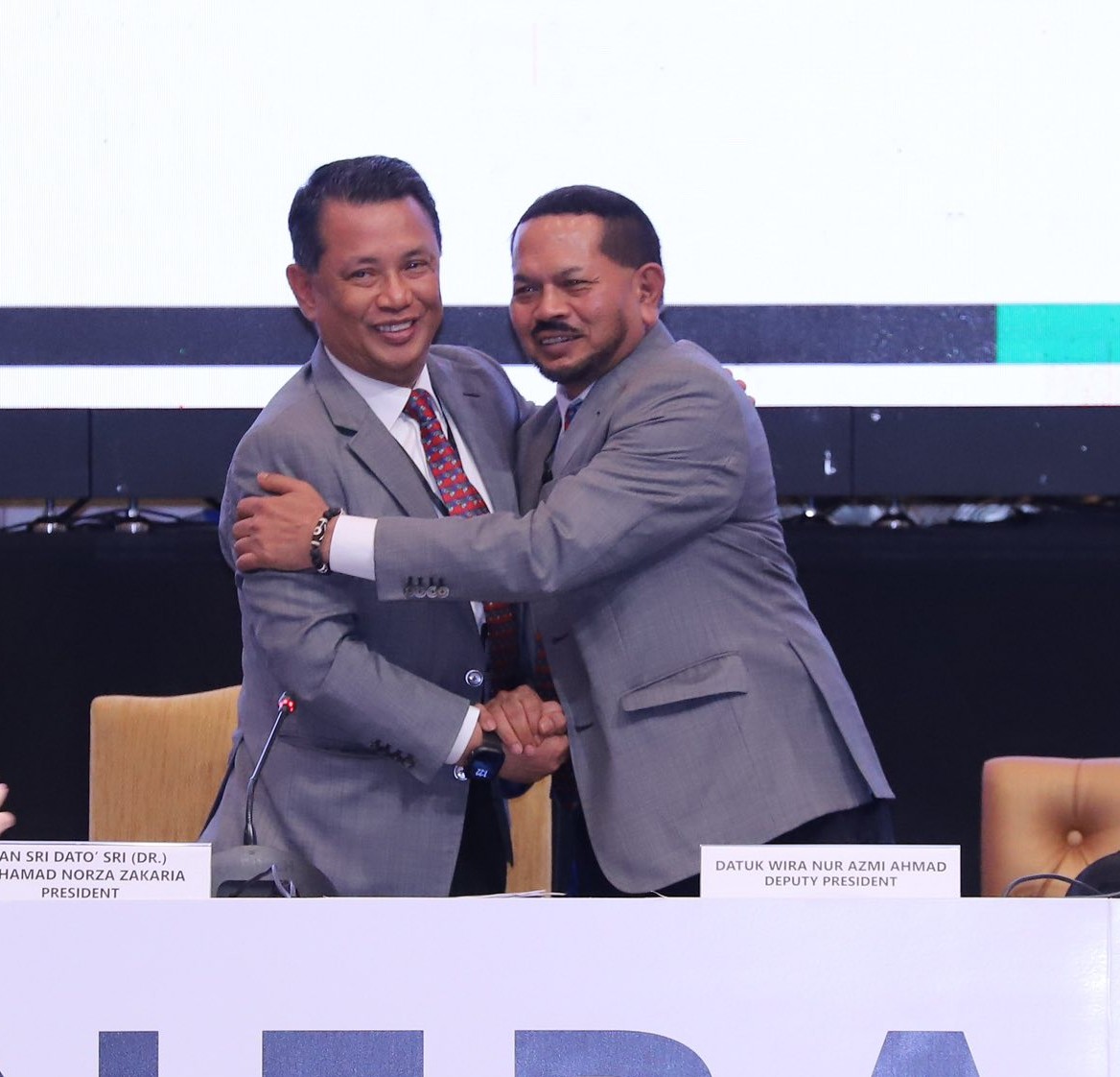 NUR Azmi Ahmad (kanan) bersalaman dan berpelukan dengan Mohamad Norza Zakaria selepas diisytiharkan secara rasmi sebagai Timbalan Presiden dan Presiden MOM penggal 2025-2029 oleh Panel Bebas Pemilihan. - Kredit foto: FAM