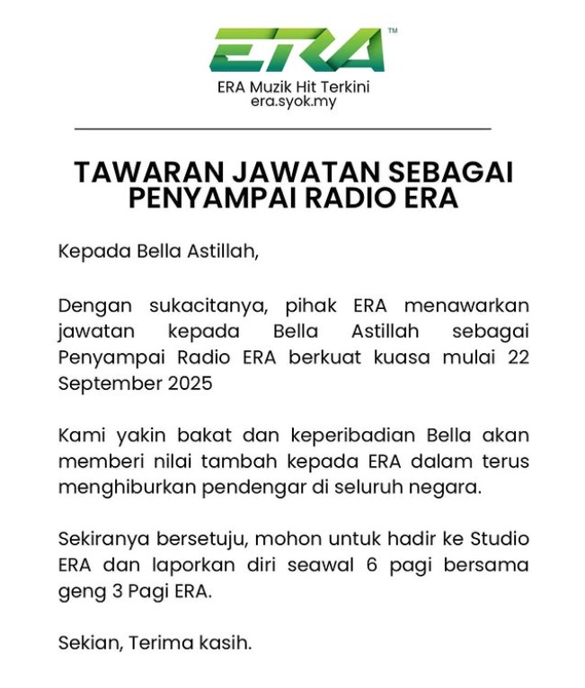 Stesen radio itu meminta Bella hadir di konti ERA FM pada jam 6 pagi 22 September 2025 jika bersetuju menjadi DJ. Bagi Bella tawaran itu sebagai rezeki datang bergolek. Dia memang ingin mencuba pelbagai bidang seni.