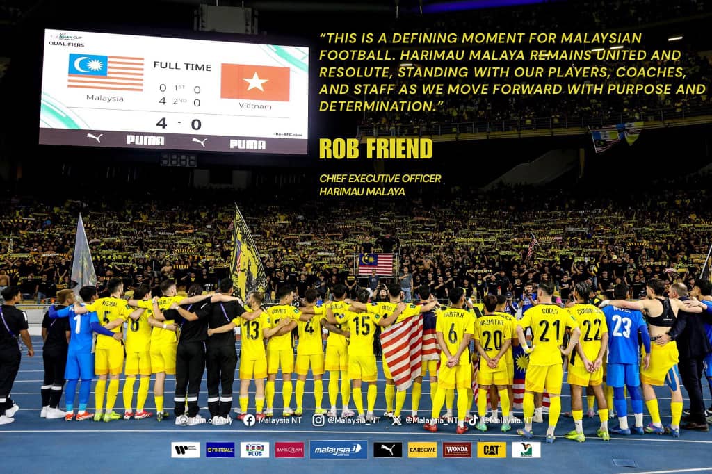 Sebaliknya Ketua Pegawai Eksekutif (CEO) Harimau Malaya, Rob Friend berkata, skuad mahu memberi fokus kepada persiapan dengan memastikan pasukan tampil lebih mantap dalam aksi Kelayakan Piala Asia 2027 menentang Laos pada Oktober 2025 ini."Sebagai Harimau Malaya, fokus penuh kami adalah ke hadapan dengan menyediakan pasukan yang kuat untuk perlawanan kelayakan akan datang menentang Laos. "Kami mahu memastikan disiplin, profesionalisme dan prestasi di padang terus mencerminkan kebanggaan serta semangat negara," katanya dalam satu kenyataan pada Isnin 29 September 2025.