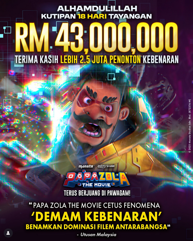 Namun kini animasi ‘Papa Zola The Movie’ terbitan Monsta Studios arahan Nizam Razak dan mula ditayang pada 11 Disember 2025 dijangka mampu mengalahkan kutipan EATM2 dan ‘Mechamato Movie’ (2022): RM 35.88 Juta (Animasi).
