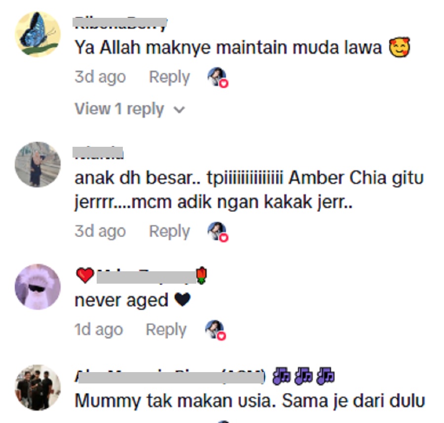 Sementara itu, ada juga yang berseloroh, “Anak dah besar, tapi Amber Chia gitu jer, macam adik dengan kakak.”