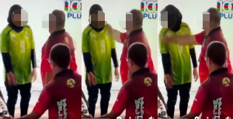 Pemain kedua pula menerima nasib yang sama seperti pemain yang pertama apabila tangan jurulatih tersebut turut menghayun tangannya ke pipinya. - Skrin tangkap layar sebuah video tular