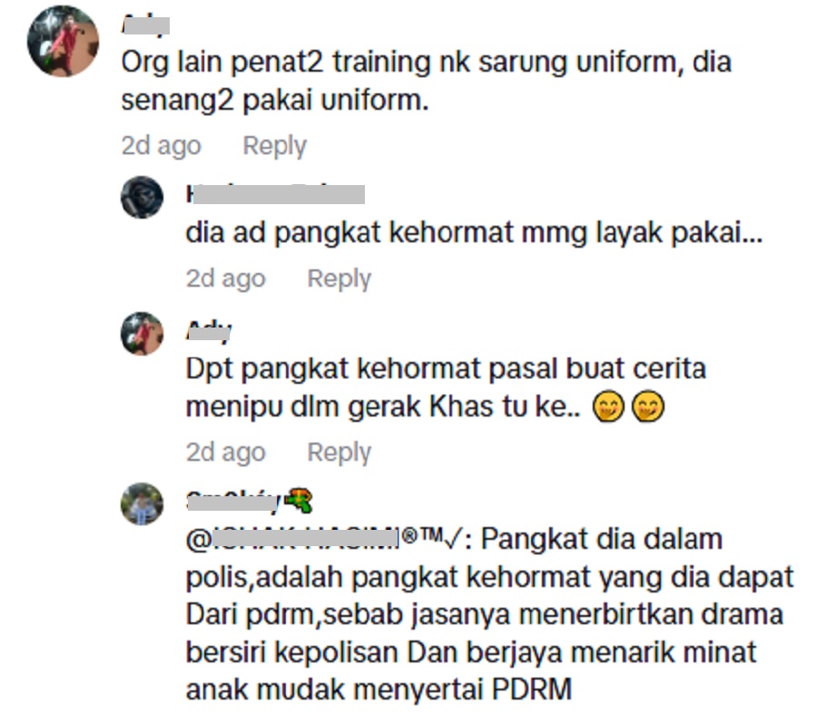 Persoalan itu turut dijawab oleh sesama netizen. Menurut salah seorang netizen, oleh kerana pelakon tersebut pernah menerima anugerah ACP daripada PDRM, maka dia layak memakai uniform tersebut.