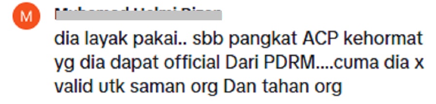 “Dia layak pakai sebab pangkat ACP kehormat yang dia dapat secara rasmi daripada PDRM. Cuma dia tak boleh saman dan tahan orang,” jelasnya.