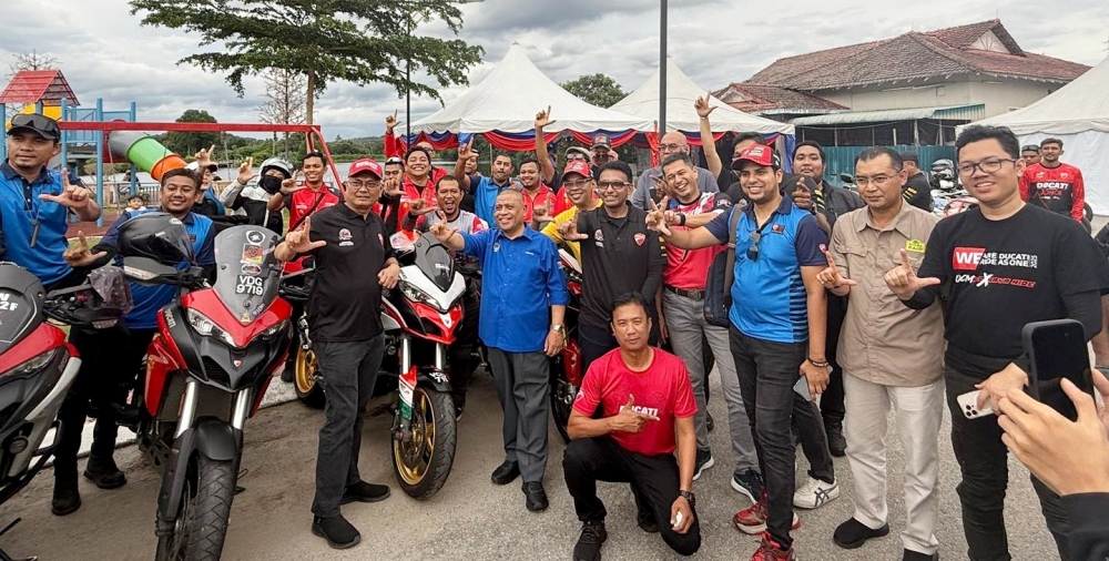 Saarani (tiga, kanan) melihat motosikal Ducati yang akan menyertai kejohanan sukan lasak antarabangsa, Lenggong Rimba Raid 2025 di Lenggong pada 26 Jun 2025 ini.