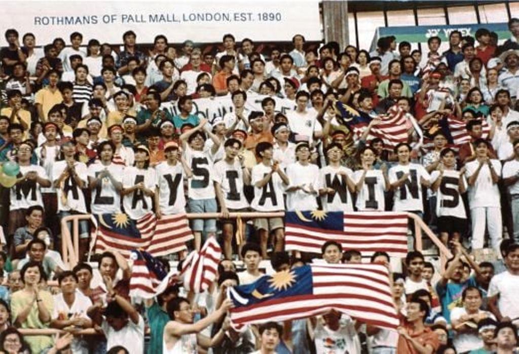 Kegembiraan penonoton di Stadium Negara ketika skuad badminton Malaysia menumpaskan Indonesia pada final Piala Thomas 1992. Kredit foto : Harian Metro.