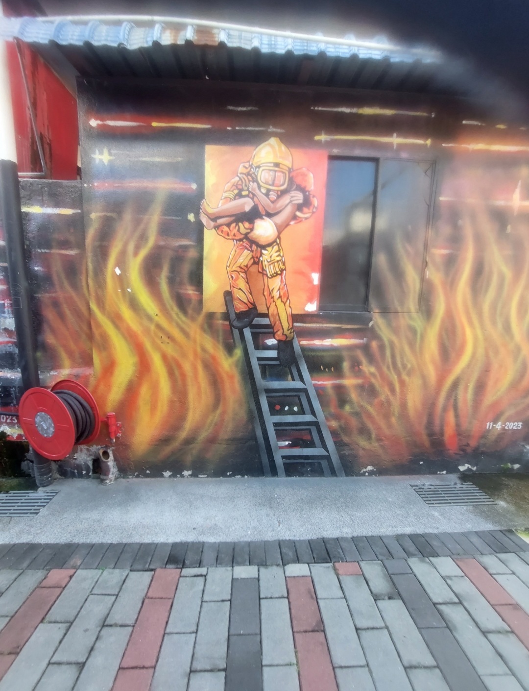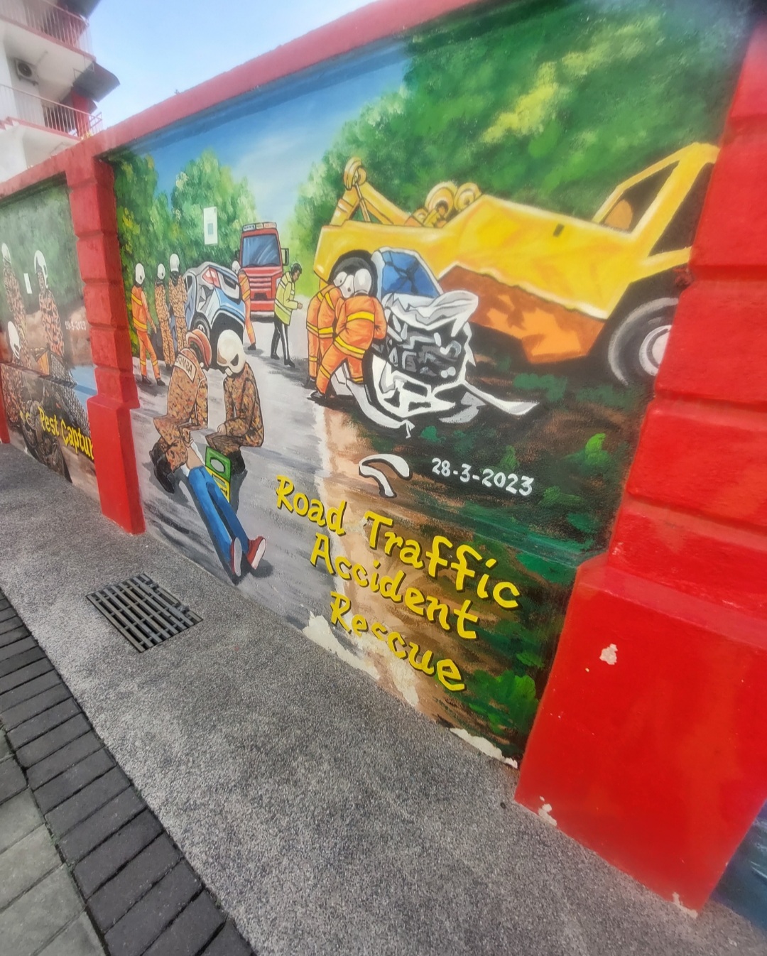 Mural sepanjang 100 meter ini mempamerkan tugas hakiki dan kepakaran anggota bomba dalam melakukan kerja-kerja menyelamatkan mangsa termasuk manusia, haiwan maupun harta benda.