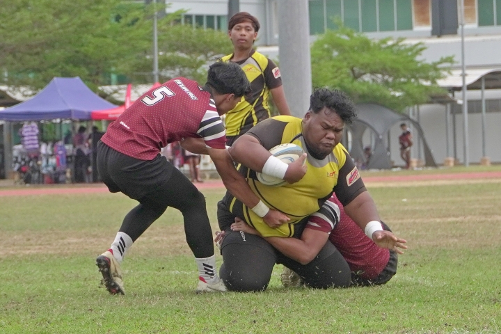 Pemain pasukan KPTM Bullets RC (jersi berwarna kuning) cuba melepasi kubu lawan pasukan IPG Kota Bharu dalam perlawanan peringkat kumpulan Kejohanan Ragbi 25 Tahun UMT yang telah berlangsung di padang Kompleks Sukan Tengku Muhammad Ismail, UMT, Kuala Nerus, Terengganu.
