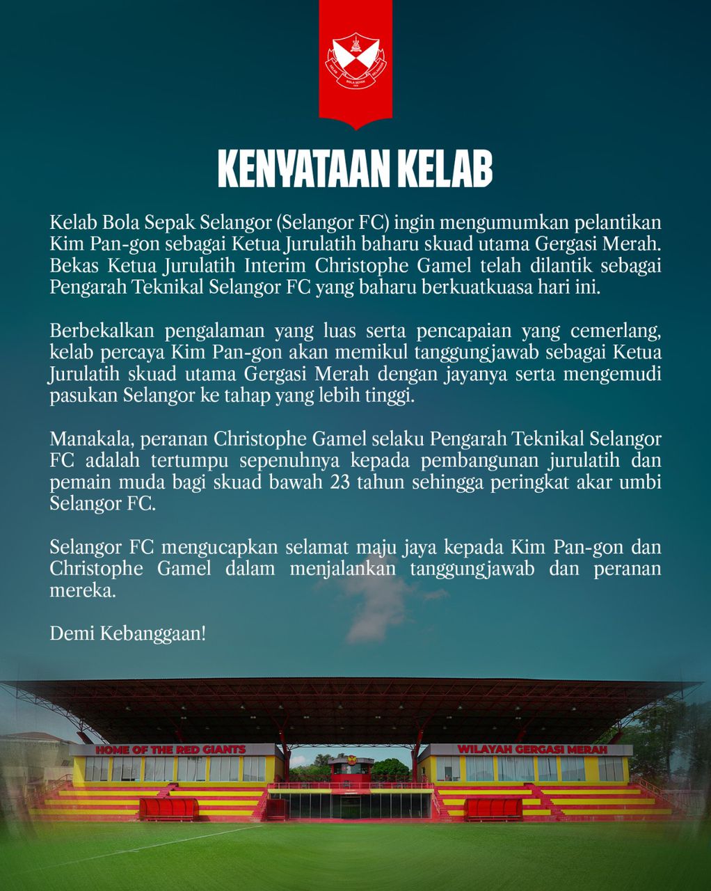 Pelantikan Kim Pan-gon sebagai ketua jurulatih Selangor FC bukan sekadar perubahan jawatan di 'kerusi panas', tetapi satu mesej berani kepada landskap bola sepak tempatan; skuad Red Giants (Gergasi Merah) mahu kembali 'berkuasa', bukan sekadar bersaing.