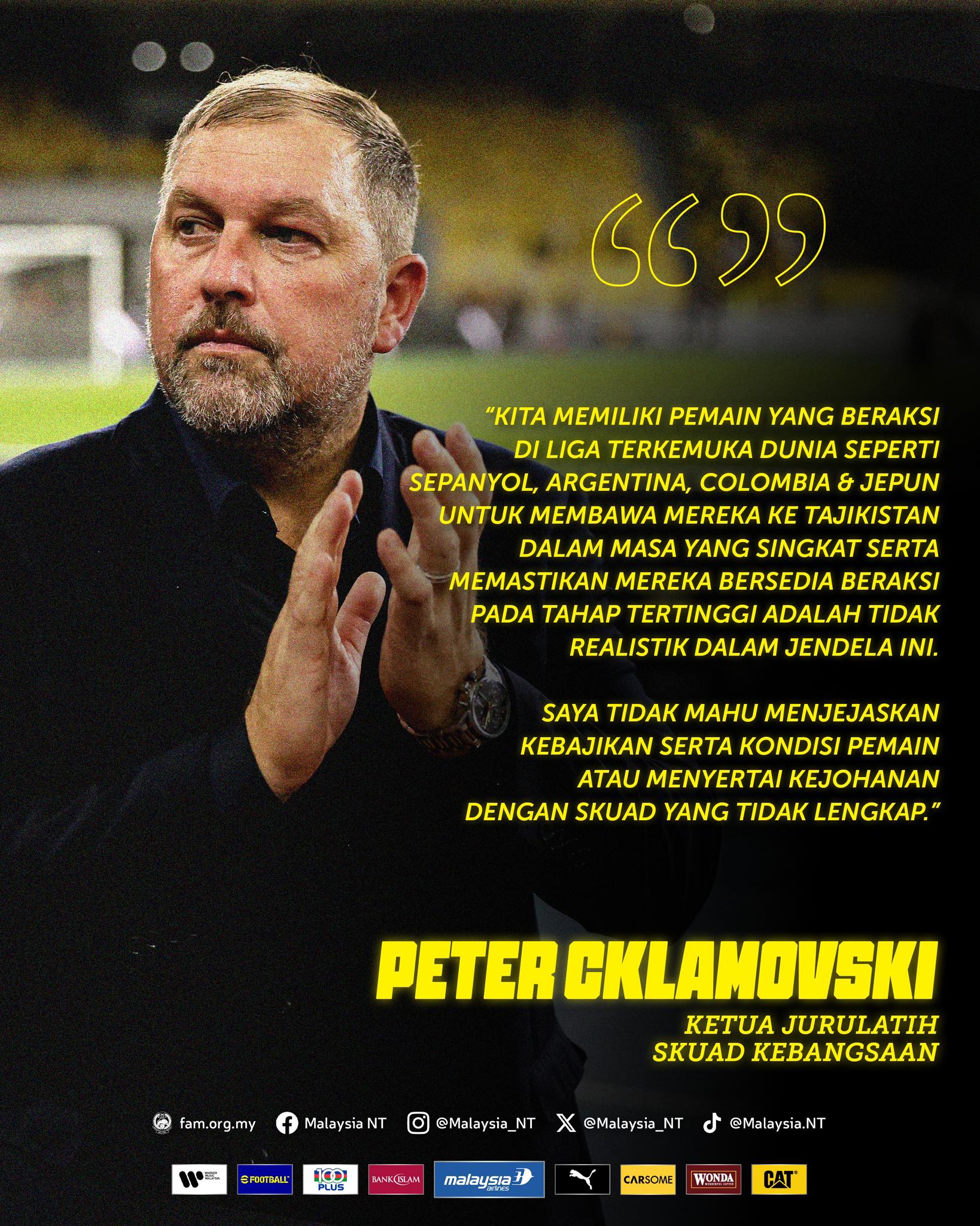"Ini senario yang sukar kepada pemain untuk ke sana (Tajikistan) dan bersedia menjalani persiapan. Saya tidak mahu berkompromi dengan pemain," katanya.