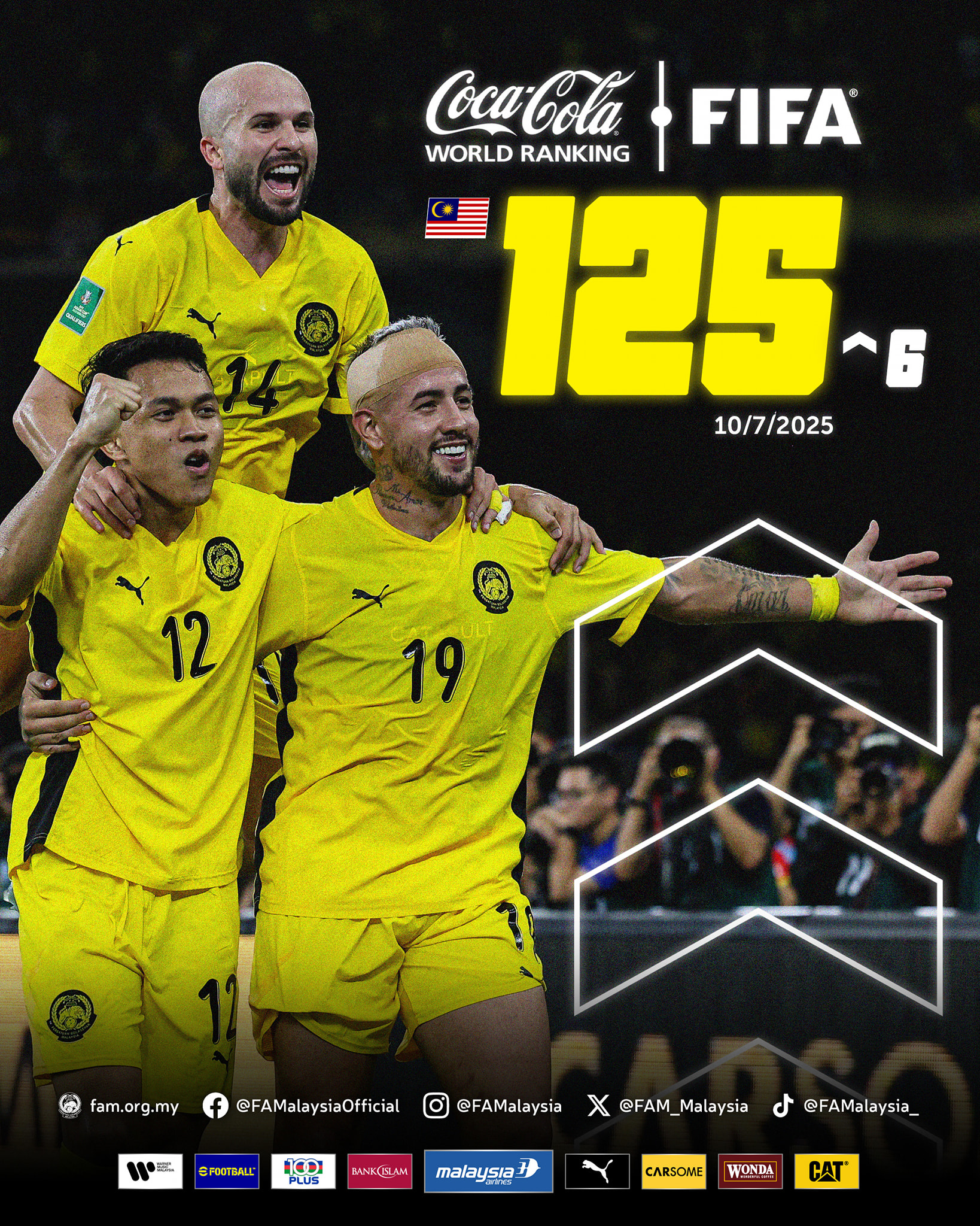 Malaysia kini berada pada kedudukan 125 dunia selepas naik enam anak tangga ekoran kemenangan 4-0 ke atas Vietnam pada kelayakan Piala Asia 2027 di Stadium Nasional Bukit Jalil, pada 10 Jun, 2025 lalu.
