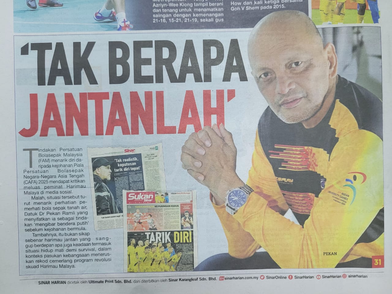 Isu kedua yang kini menjadi topik perbincangan komuniti bola sepak tempatan adalah keputusan skuad kebangsaan, Harimau Malaya menarik diri daripada menyertai kejohanan Piala Negara-Negara Persatuan Bola Ssepak Asia Tengah (CAFA) 2025 yang dijadualkan pada 29 Ogos hingga 9 September, 2025.