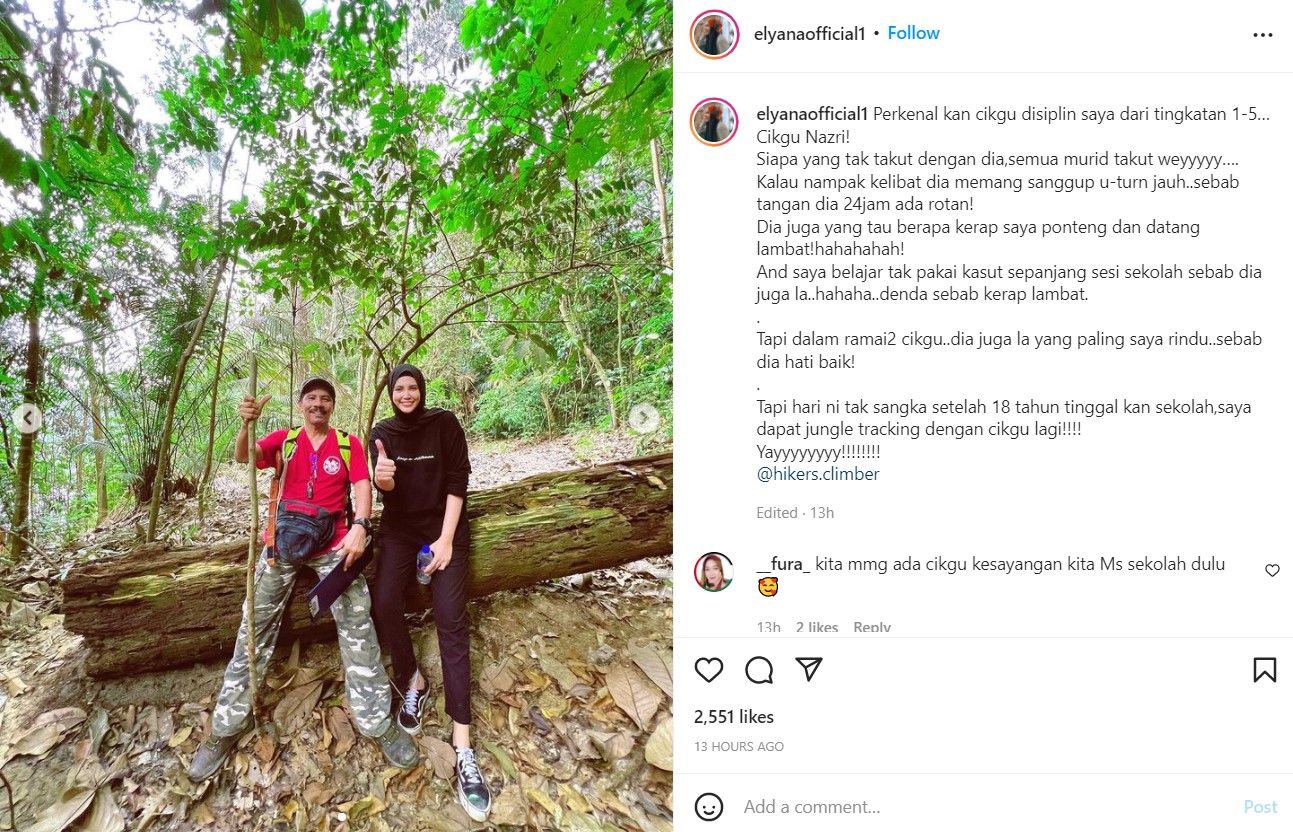 “Tapi dalam ramai cikgu, dia jugalah yang paling saya rindu sebab dia hati baik! Tapi hari ni tak sangka setelah 18 tahun tinggalkan sekolah, saya dapat jungle tracking (rentas hutan) dengan cikgu lagi!!!!” tulis Elyana.
