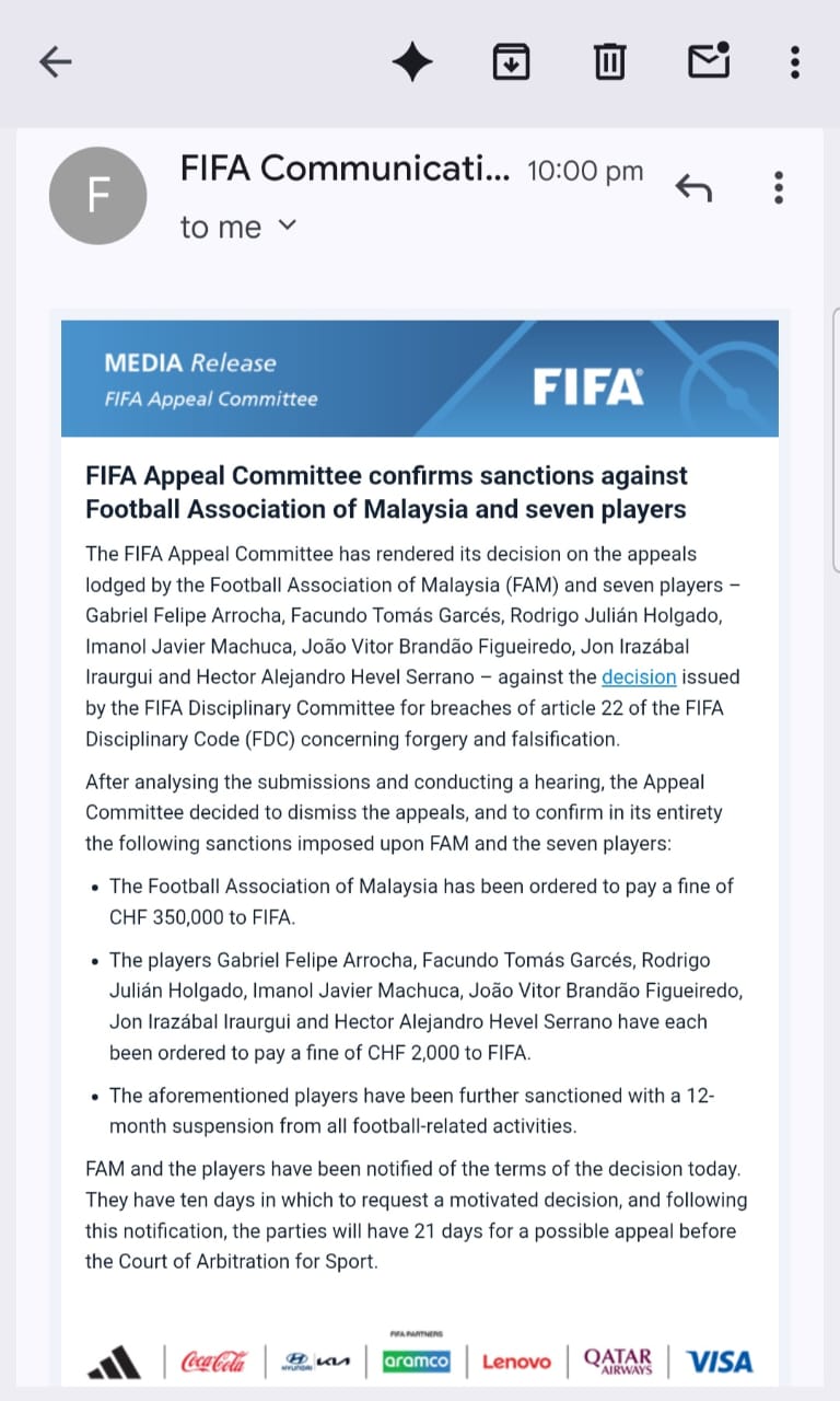 FIFA memaklumkan pihaknya mengekalkan keputusan Jawatankuasa Tatatertib FIFA yang mendapati FAM dan tujuh pemain berkenaan melanggar Artikel 22 Kod Tatatertib FIFA (FDC).