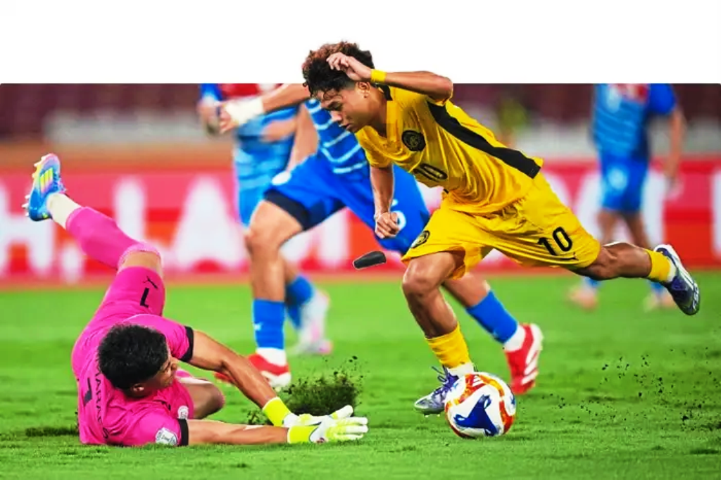 Aksi Mohd Harry Danish Mohd Haizon ketika Malaysia B-23 menentang Filipina pada Pertandingan Piala AFF B-23 pada 2025. - Kredit foto:The Star.