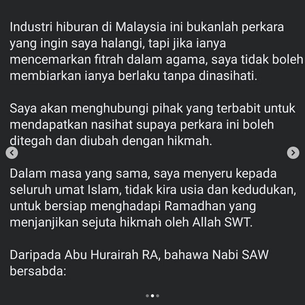 Tambahnya, hiburan tidak dihalang dalam Islam namun jika ia melampaui batas dan boleh mencemarkan agama ia tidak boleh dibiarkan.