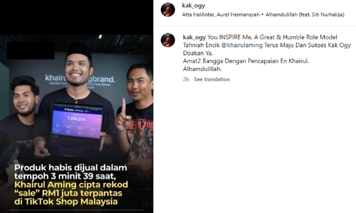Dalam Instagram miliknya, Ogy menzahirkan rasa kagum terhadap kehebatan Khairulaming sekali gus memberi contoh terbaik kepada masyarakat khususnya yang menceburi bidang perniagaan.