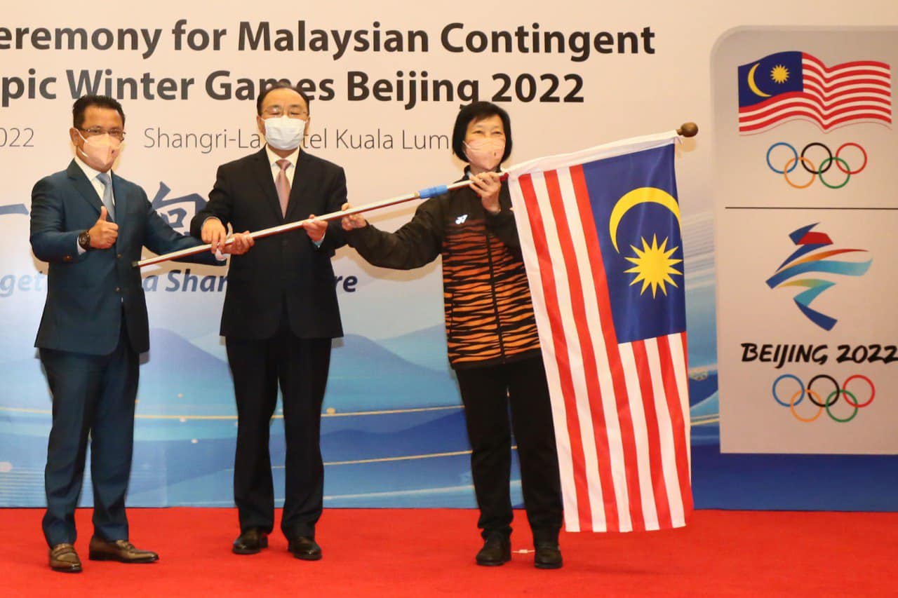 KONTINJEN Malaysia pada Sukan Olimpik Musim Sejuk Beijing 2022 mengibarkan Jalur Gemilang mini. - Kredit foto: MOM