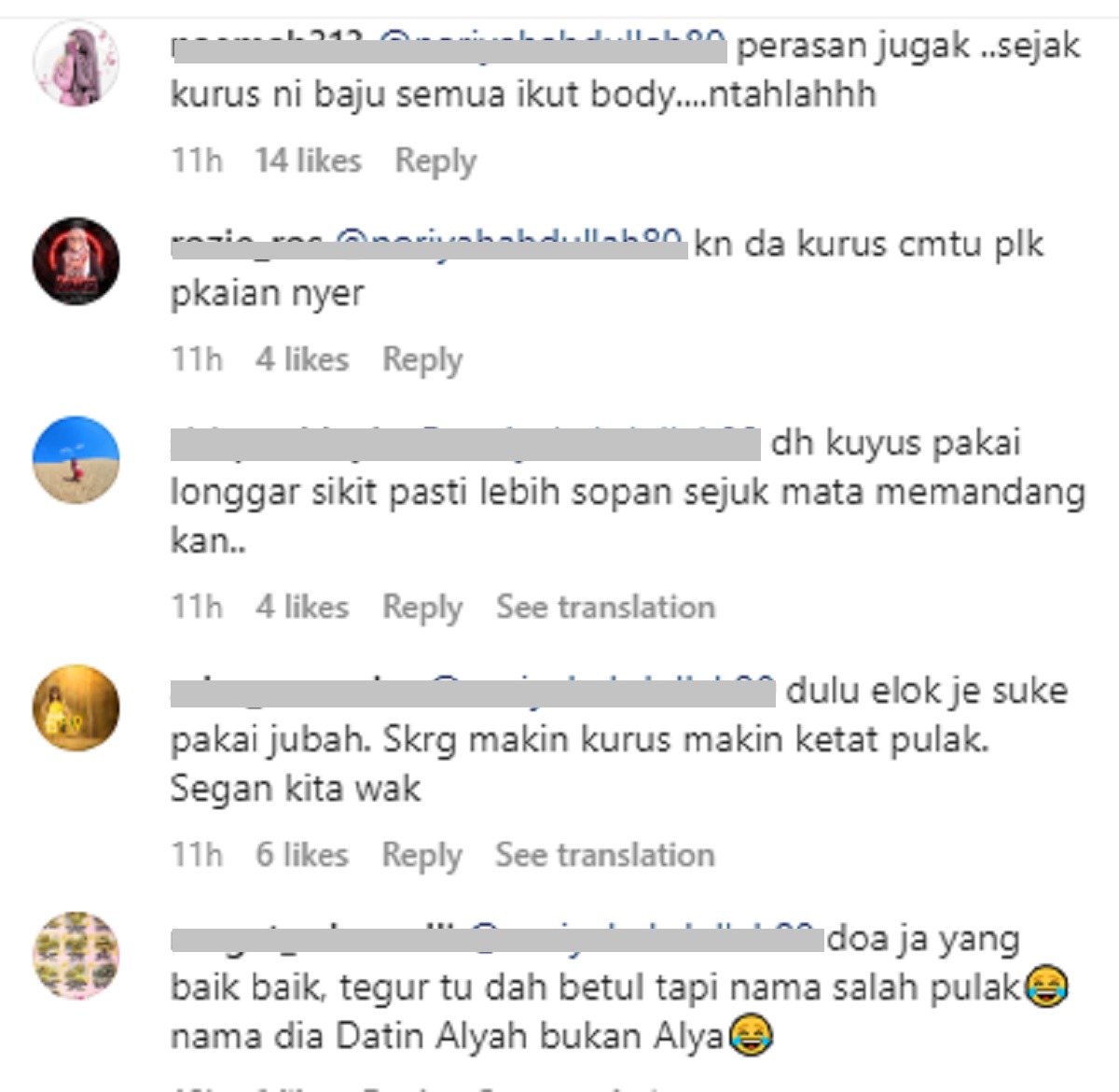"Cantik Alyah, cuma janganlah pakai ketat sangat macam tu. Takut Allah tarik nikmat lain pula. Ketat sangat bajunya, pendek sangat tudungnya. Sayang jika terus macam ni," tulis individu tersebut.