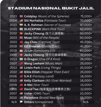 Jumlah penonton itu kekal selama 19 tahun, apabila rekod itu dipecah oleh band Coldplay dari Britain pada 20 November 2023.