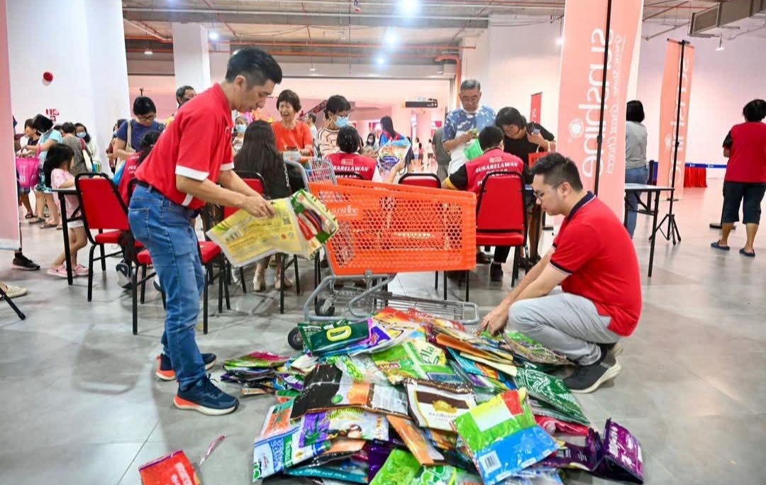 Orang ramai yang membanjiri pekarangan Hotel Atrium Sunshine Central Mall, Farlim bagi program Kitar Semula Beg Plastik Beras dengan membawa pelbagai jenama beg beras kosong 5 kilo atau 1 kilo boleh mendapat 1 kilo beras wangi Premium Jasmine Sunwhite secara percuma.