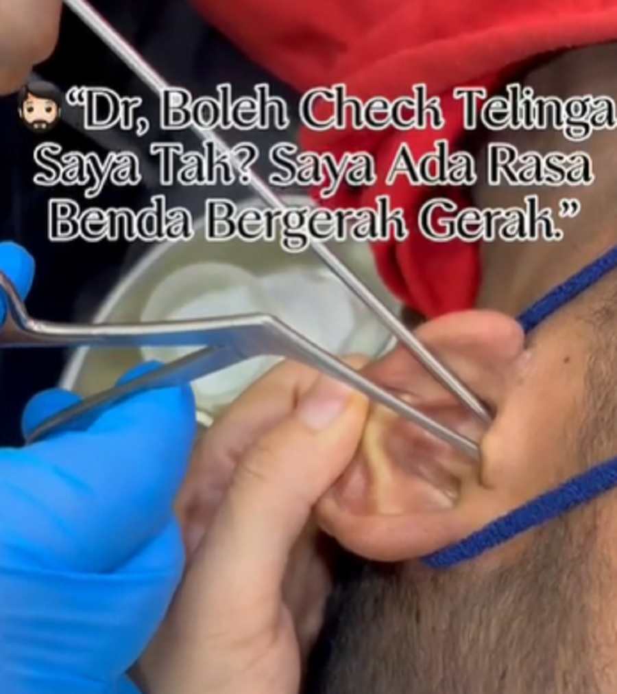 Video tersebut memaparkan seorang pesakit lelaki yang datang mendapatkan rawatan selepas merasakan ada sesuatu bergerak di dalam telinganya.